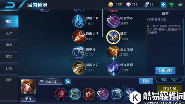 解析:后期是团战的爆发期,李白这类英雄非常依赖技能的爆发。破甲弓和破军除了提供高额物理攻击之外,其被动还能增加李白的护甲穿透,当目标血量低于一半时伤害能力还能再次大幅度加强,让李白不管是面对脆皮还是坦克都能做到十步杀一人。