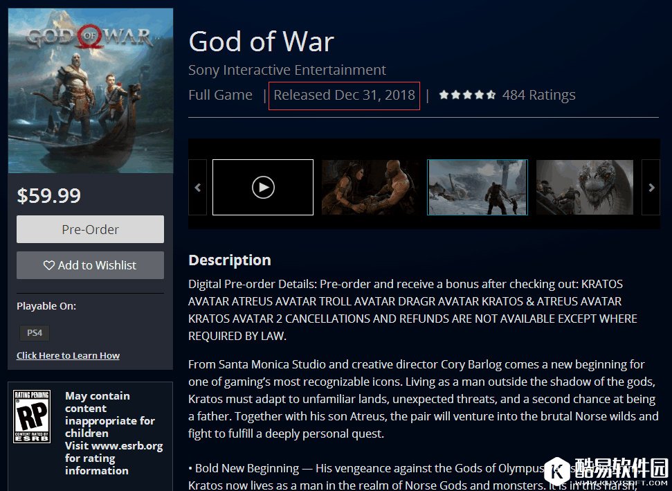 《战神》新作一开始欧服PSN商店的发售日期为2018年3月22日,但是小编据今天最新消息得知《战神》新作已经更改了日期,所以正式发售时间为2018年12月31日,售价为59.99美元。