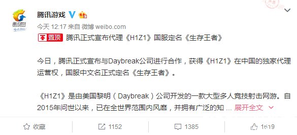 今天中午,小编在腾讯游戏的官微上看到了一则消息,腾讯将正式宣布代理《H1Z1》这款游戏,并且更名为《生存王者》。小编在这里要恭喜腾讯。