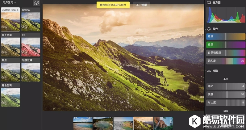 首先它的滤镜分为几个大类,比如曲线滤镜组、美食滤镜组、胶片滤镜组等十几种大类,下面让小编详细介绍一下,首先曲线滤镜组,它可以让你的照片在色彩的搭配上更加的突出,但是这个滤镜使用的人并不多。