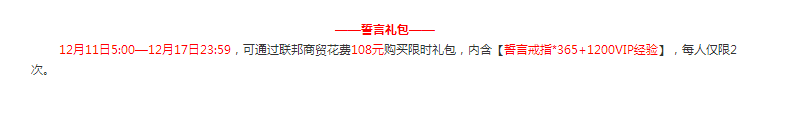 最后誓言礼包会上架商城,这个礼包活动也是限时的,时间是从12月11日开始至12月17日结束,只要在活动期间购买都是可以的,礼包内的奖品也非常的丰厚,绝对超值,但是每人只有两次的购买机会。以上两个活动感兴趣的玩家从今天起就可以参加了,小编也会持续关注官方的消息,一有消息会立马告诉你们的。