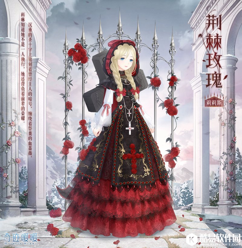 衣服上也有镶嵌着十字架样式的玫瑰,人物的背后是尖尖的栅栏,应该是象征着“荆棘”。而“荆棘”上爬满了玫瑰,地上也散落着一些玫瑰的花瓣,总之,和这一款套装的名字“荆棘玫瑰”相呼应了。喜欢这一款套装的小伙伴可以在更新之后在联盟小铺中购买哦!当然在购买的同时别忘了逛一逛联盟小铺,也许还有其他你喜欢的套装呢!