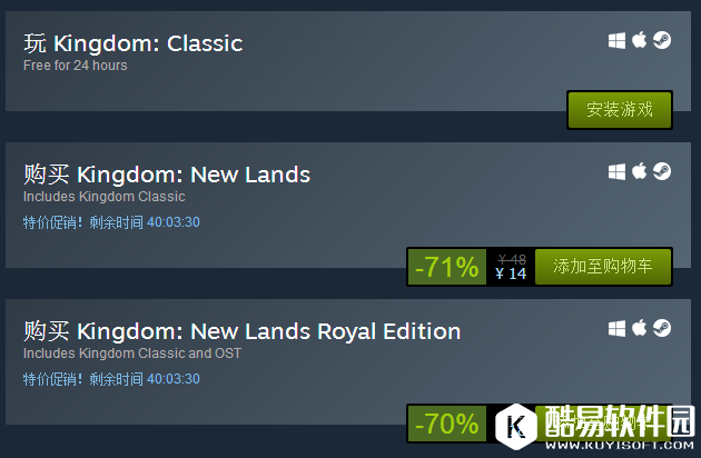 首先这款游戏的原价是48元,免费领取的活动实在是太划算了,直接点击安装游戏再登录Steam平台就可以了。而《王国:新大陆》这款游戏也在做促销,原价48元现在只需要14元,感兴趣的玩家都可以一并购买哦!