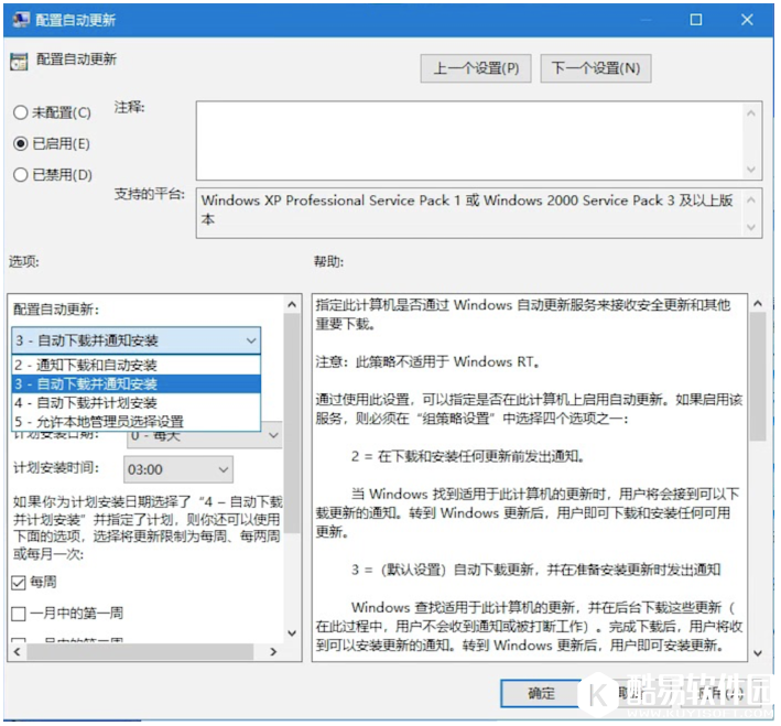 如果你想正常接收更新、只是不满自动重启,可以修改该项值为「已启用」,然后下拉菜单,选择「自动下载并通知安装」。