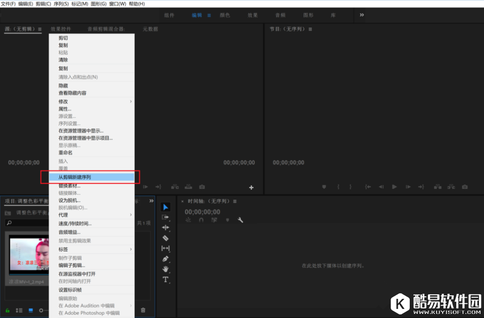 导入视频素材,鼠标右键单击视频,点击“从剪辑新建序列”,