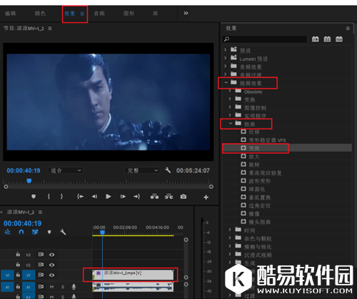 选中视频轨道,点击上方的效果,在右侧栏中点击视频效果——扭曲,然后双击“变换”,