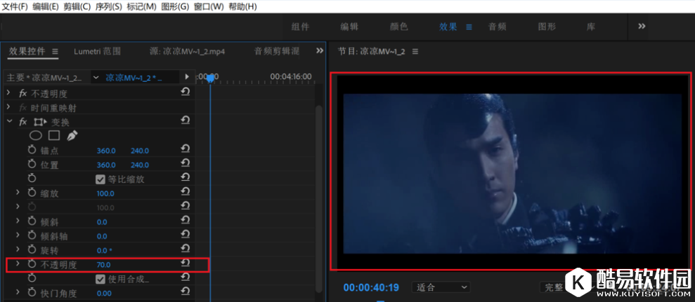来到左侧的效果控件窗口,点击“不透明度”,调整它的参数值,