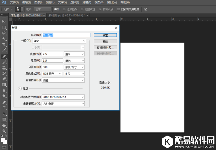 打开Photoshop软件,点击菜单栏中的文件——新建,弹出窗口,设置宽为2.5CM、高为3.5CM、分辨率为300,
