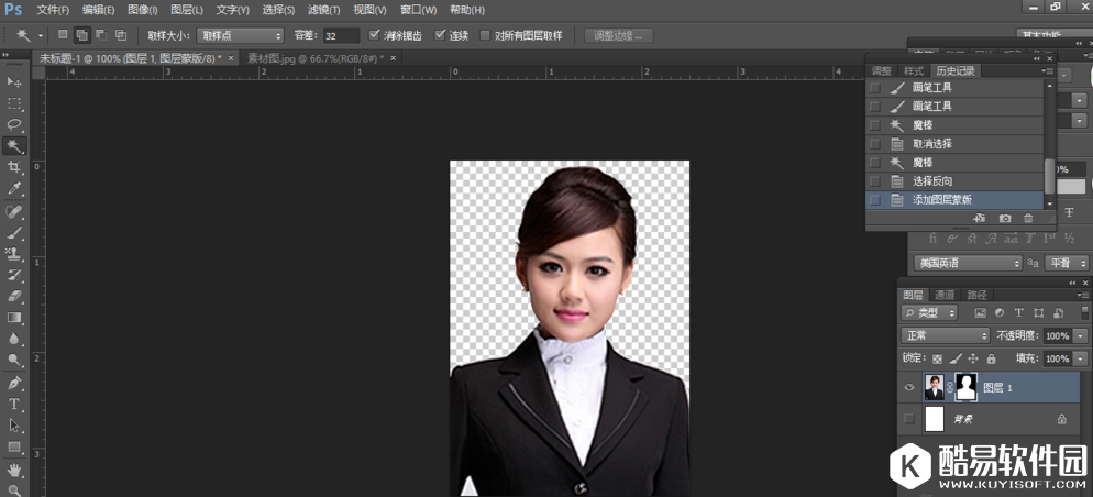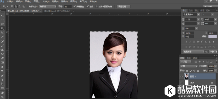 点击左侧工具栏中的“魔棒工具”,设置合适的“容差”,单击白色背景得到选区,