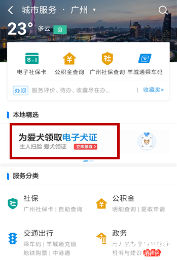 进入城市服务界面,可以看到【为爱犬领取电子犬证】这一功能,点击该功能,