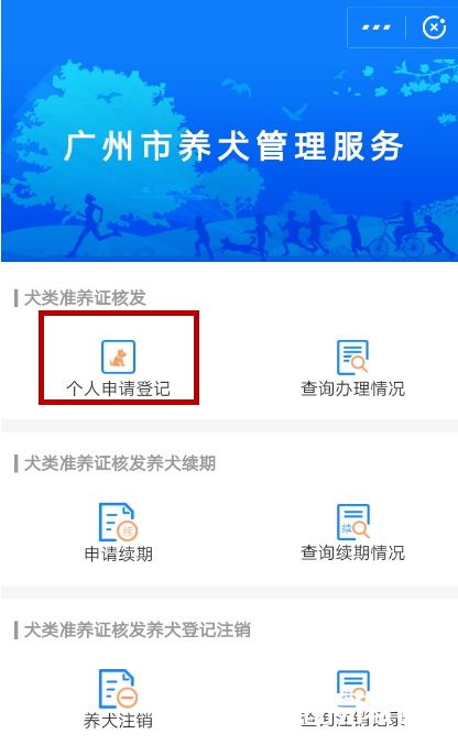 进入养犬管理服务界面,如果是新办理,点击【个人申请登记】,