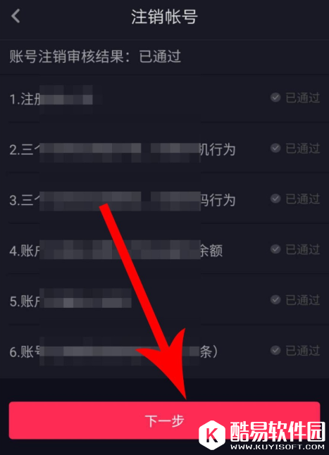 进入注销账号界面,通过6个审查项,点击“下一步”,查看注销账号说明,最后点击“确认注销”即可。