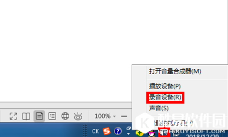右击桌面右下角的扬声器图标,出现弹窗,点击【录音设备】,
