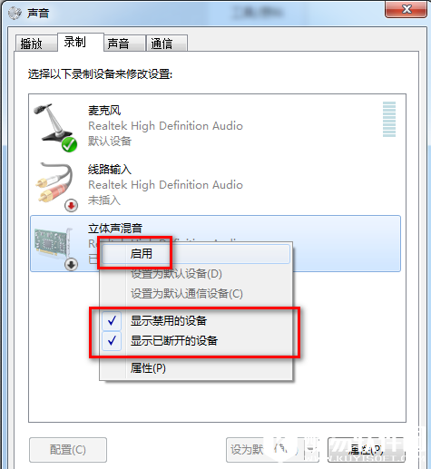 进入界面,右键【立体声混音】、选择【启用】,如果找不到立体声混音选项,可以在空白处点击选择显示禁用设备,