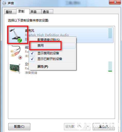 右键【麦克风】、点选【禁用】,这么做可以防止出现杂音,