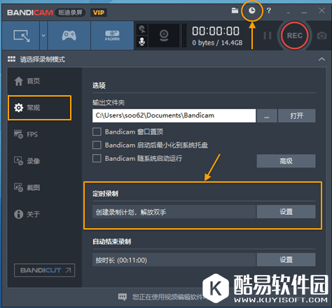 打开Bandicam软件,进入界面,点击【常规】,在右侧点击定时录制的【设置】按钮,或者点击右上角的时钟图标。