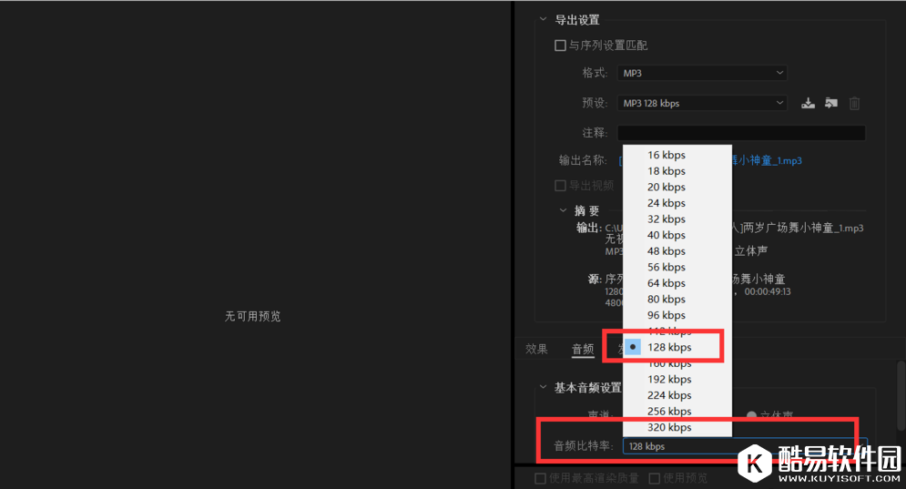设置音频比特率的数值,也可以在【预设】中选择,然后点击导出,导出完成,查看文件效果。
