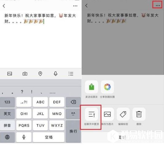 编辑输入文字(支持表情图片),然后点击右上角的【...】菜单,弹出选项,点击【在聊天中置顶】,如图,