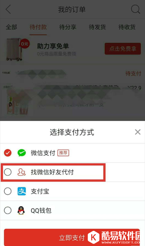 弹出选项,选择付款方式,这里点击“找微信好友代付”,