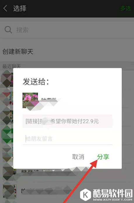 选择某一位微信好友,点击分享,对方就能收到邀请了。