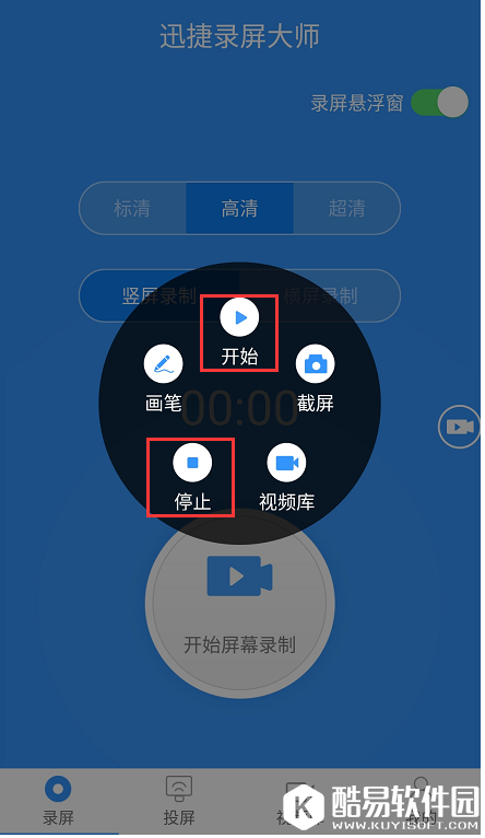 悬浮窗舒展开来,点击【开始】即可正式录制视频,点击【停止】即可结束本次录制,此外,我们还可以使用截屏、画笔等功能。