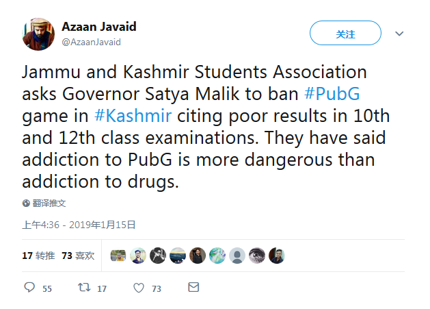 查谟和克什米尔的学生协会要求当地州长封禁PUBG手游,因为这款游戏导致了学生成绩不佳,其次他们还表示:绝地求生手游的成瘾性几乎比毒品成瘾还要危险。