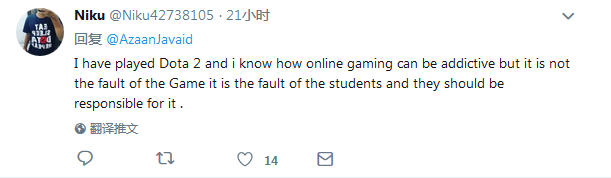 大意:我也玩过DOTA2,我知道网络游戏是如何成瘾的,但是这并不是游戏自身的问题,这是学生的错,他们应该为此负责。