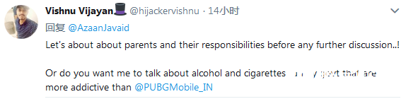 大意:在我们进一步讨论之前,让我们先讨论一下这些孩子父母的责任吧。或者你也可以和我讨论下酒精和香烟的成瘾性是不是比PUBG更大。