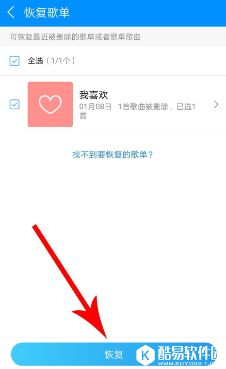 软件会自动检索最近删除的歌单和歌曲,点击勾选进行恢复,如图,
