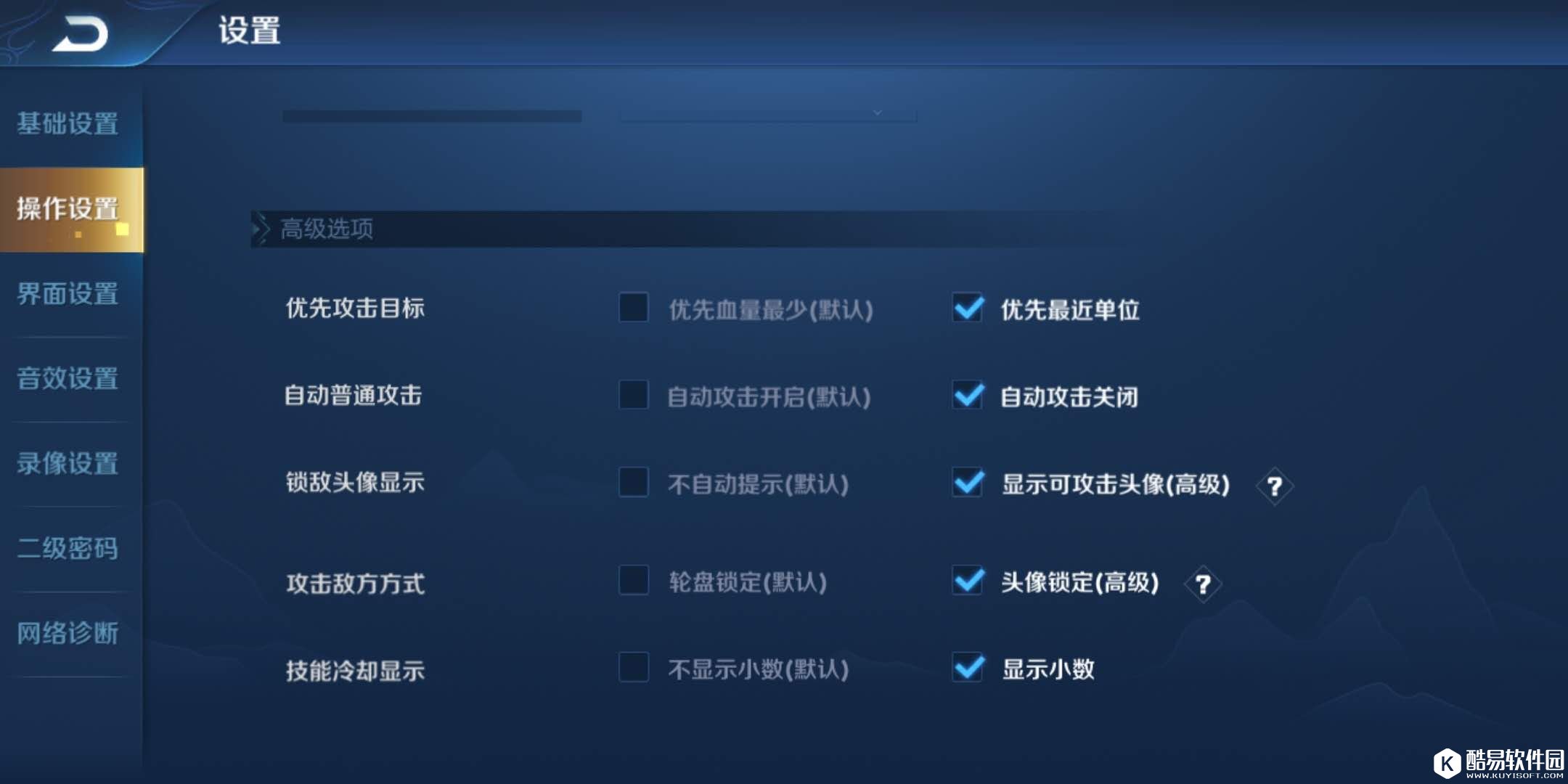 这些事受基础设置控制的举个最简单的例子补兵和图塔精准确定就是大家用的补刀推塔键,要打哪个点哪个避免点错,攻击敌人情况类似。点开设置键点到操作设置拉到高级选项看前四个。