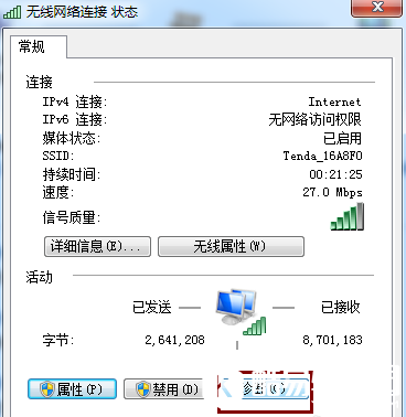 打开无线网路连接状态,点击【属性】,打开无线网络连接属性,