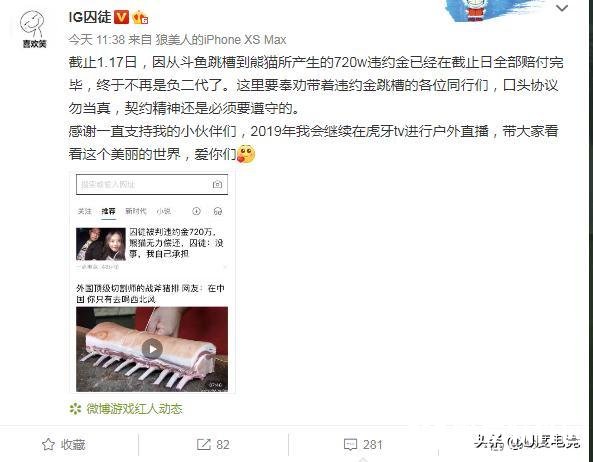 今天囚徒在微博上发布已经赔偿完违约金:截止1.17日,因从斗鱼跳槽到熊猫所产生的720w违约金已经在截止日全部赔付完毕,终于不再是负二代了。这里要奉劝带着违约金跳槽的各位同行们,口头协议勿当真,契约精神还是必须要遵守的。