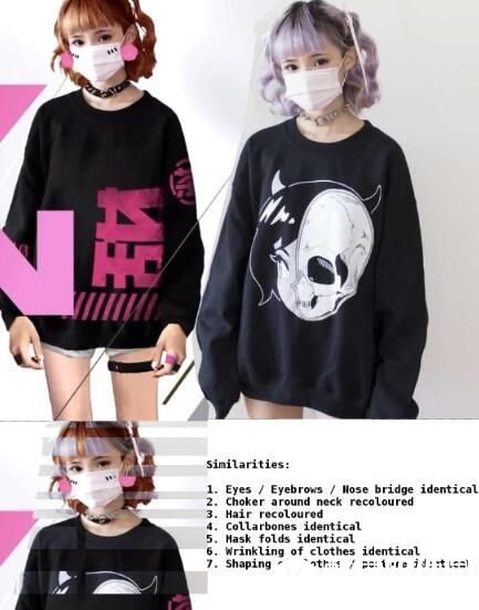 颜薇恩在个人推特详细列出了她认为涉嫌抄袭的部位对比,类似处包括:眼部(眼睛、眉毛)、鼻梁、发型、颈链、锁骨和口罩等。