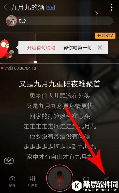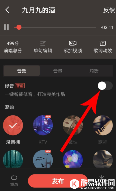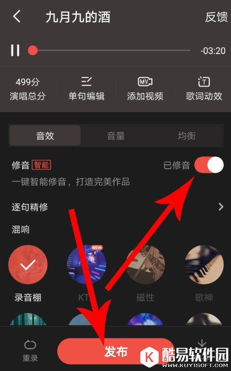 注意:只有符合条件的歌曲才支持一键智能修音,另外,启用“修音”功能之前需要在手机中插上耳机,切记!