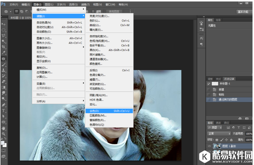 2、复制一层,对复制的图层进行去色,点击菜单栏的图像——调整——去色,或者直接按住Shift+Ctrl+U快捷键,
