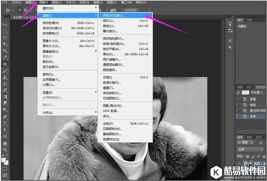3、如果黑白对比不明显,可以调整对比度,点击图像——调整——亮度/对比度,或者按住快捷键C,