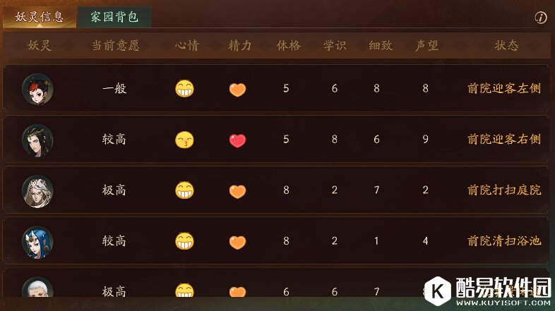 然后妖灵的放置也是有讲究的,无论是奇缘迎客打扫什么的,放置的妖灵优先选择学识高的,然后就是声望较高的。