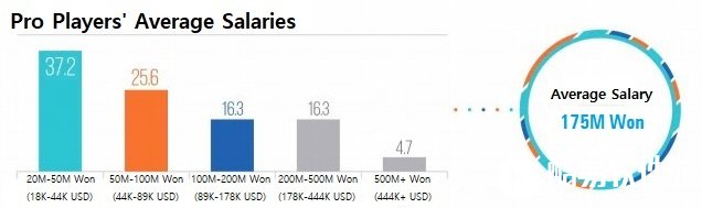不过位于电竞产业最中心位置的依然是英雄联盟。英雄联盟是电竞领域当中投入资金最多的项目,而LCK也是世界范围内顶级的著名联赛。根据一项在2018年对LCK选手的调查数据显示,LCK选手的平均工资大约是1.75亿韩元(约等于105万人民币)。不过,顶级职业选手的工资水平比平均值有着很大的提升;超过半数的职业选手年薪不到一亿韩元(约60万人民币)。37.2%的选手收入在2000万到5000万韩元之间(约12万人民币-30万人民币),而5000万到一亿韩元(约30万-60万人民币)这个范围也占了选手总数的25.6%。