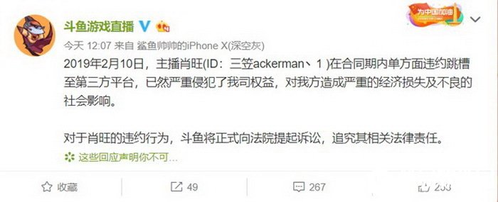 据斗鱼游戏直播官微消息,2019年2月10日,主播肖旺(ID:三笠ackerman丶1 )在合同期内单方面违约跳槽至第三方平台,已然严重侵犯了我司权益,对我方造成严重的经济损失及不良的社会影响。