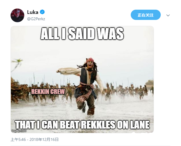 先是G2战队挖走了FNC的核心中单Caps,G2的原中单阿P转型AD,欧成本来就在生气Caps离开FNC都不和他说一声。转型AD的阿P即刻就在推特上发布了一张表情包,来形容那些看扁他的人,图片大意:当我说我可以在下路打爆Rekkles时,所有Rekkles的粉丝就都来追杀我了。
