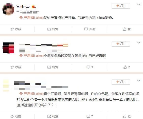 而letme本人也一直没有正面回应这些弹幕。除了直播间的弹幕之外,在letme的微博超话中,也有不少人表示对letme非常失望,在昨天还有不少粉丝以为RNG和WE的比赛中,letme会首发登场,很多人等到凌晨,虽然首发还是AJ,但是也有许多粉丝安慰自己letme还在找状态,但是看到他现在在直播,让很多粉丝认为自己昨天等首发这个行为太蠢了,做粉丝真的太卑微了,letme现在的心气呢?S8全球总决赛失利之后,很多人在各种鼓舞letme,没想到他这么懦弱,根本不敢回归赛场,现在才意识到自己喜欢的是RNG的上单letme,而不是直播的严君泽。