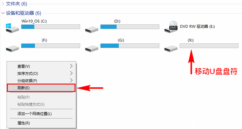 接着返回到计算机(我的电脑),可以看到里面出现了移动U盘的盘符;如果还没有显示,鼠标右击页面,进行刷新即可。