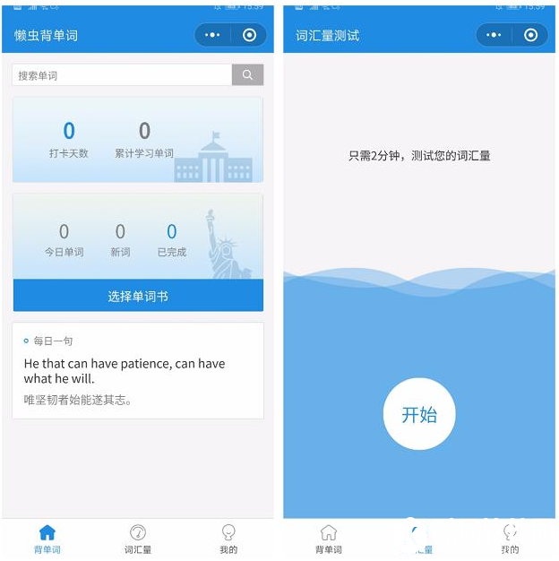 懒虫背单词,这是一款帮助大家背诵英语单词的微信小程序,学习方法非常简单,小程序会给出单词,你可以选择"认识"、"不认识",可以选择背四六级词汇,也可以花时间来测试自己的词汇量。这款小程序除了有查词功能、也有例句功能,基本满足背单词的需求。