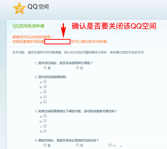 进入QQ空间关闭申请页面,首先确认当前要关闭QQ空间的号码是否准确,