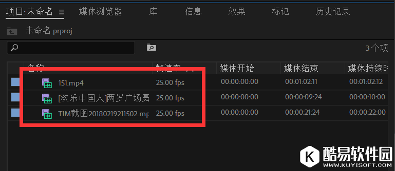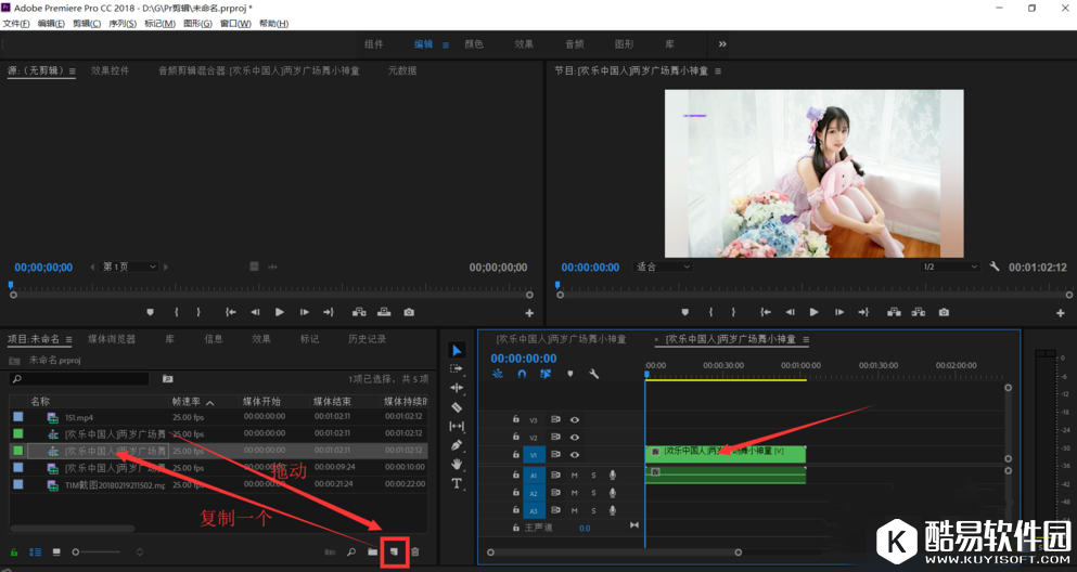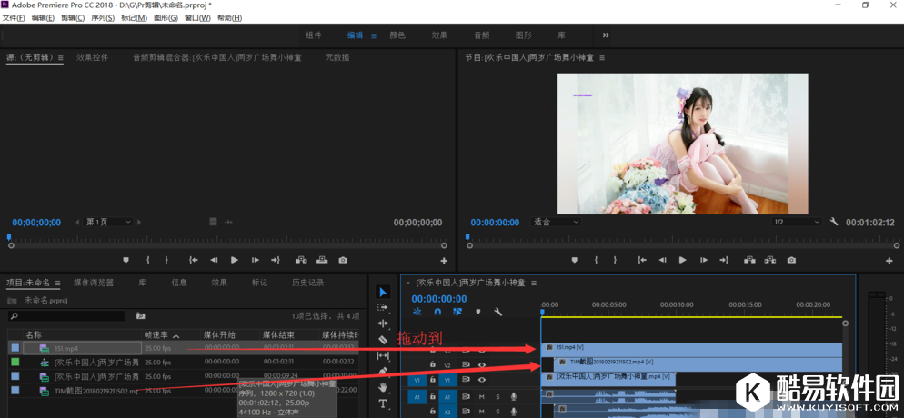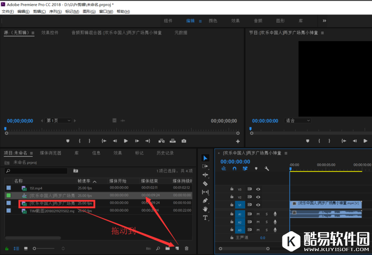 选中一个视频,将其拖动到右下方的新建项图标,以此新建一个序列,然后将另外的视频拖入时间轨道,