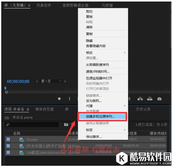 将视频素材导入到项目面板,同时选中所有素材,右键点击创建多机位源序列,