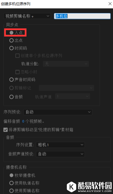 设置同步点,这里设置为入点,再设置下面的各个参数,声音设置为相机1,