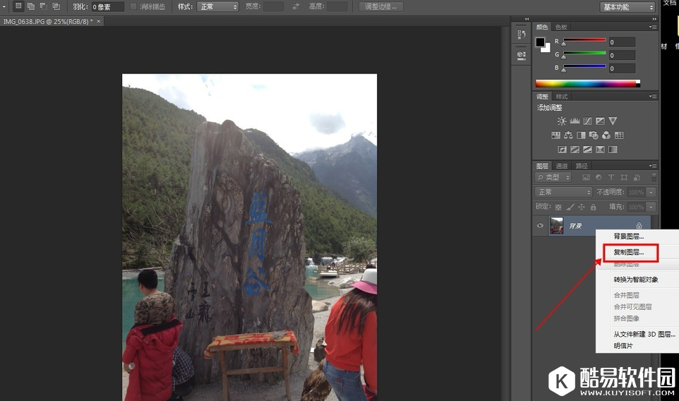 选中图片,鼠标右击,弹出下拉菜单,点击“复制图层”,此时就会得到“背景 副本”图层,如图所示,
