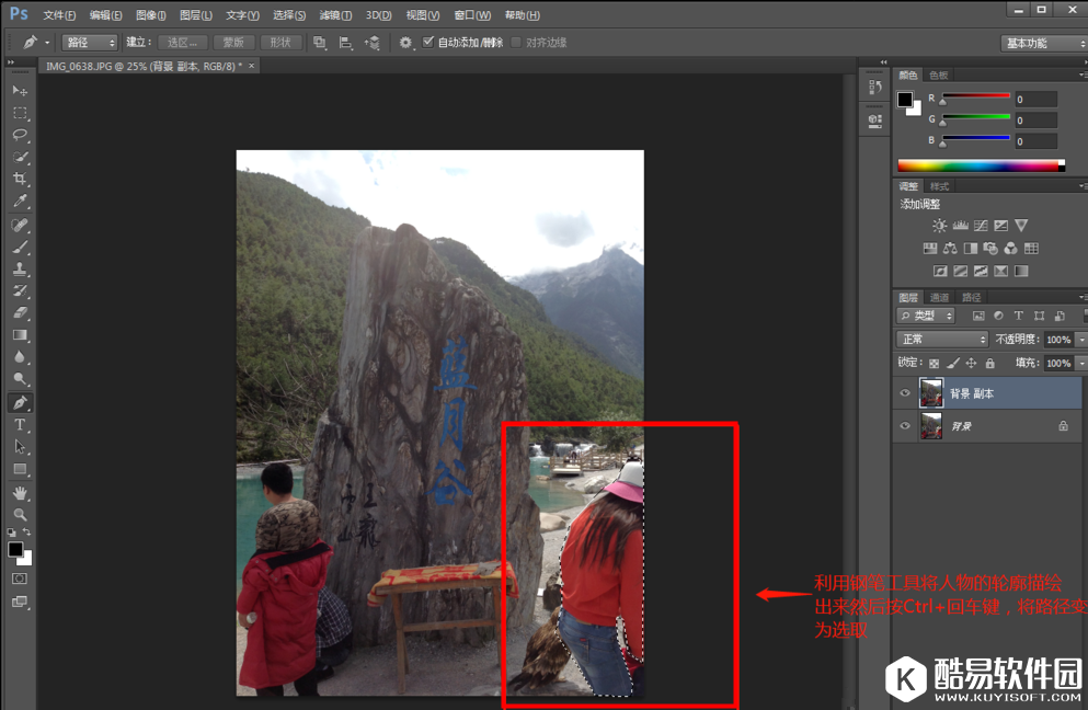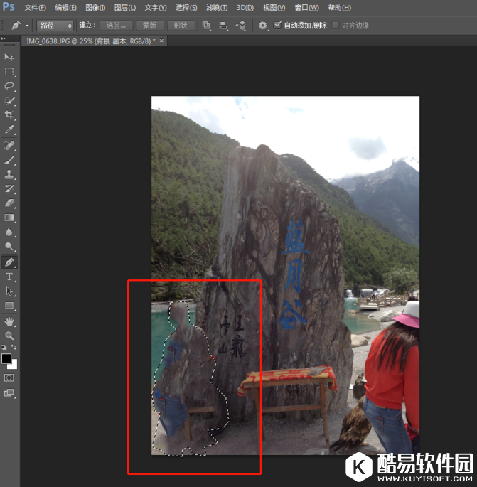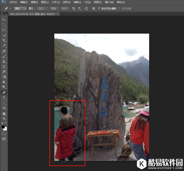 选择“钢笔工具”,将要清除的人物轮廓给描绘出来,如图所示,