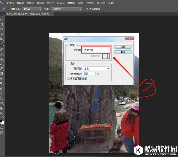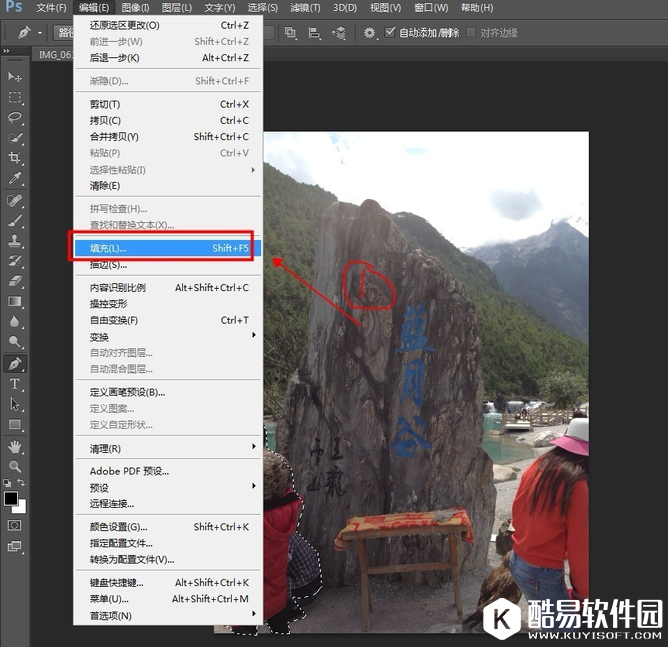 然后依次点击菜单栏的“编辑”——“填充”——“内容识别”,如图所示,